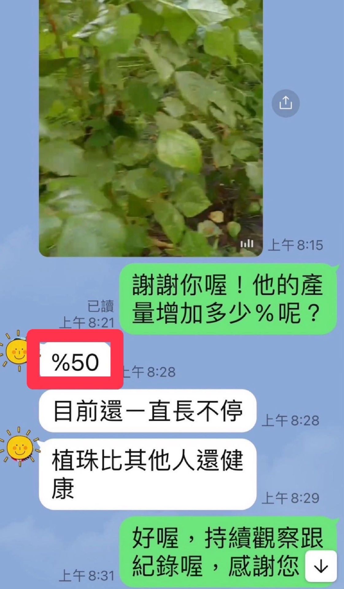 配合使用綠森林另一項明星產品——蚓激速胜肽營養液進行每週一次灌根,可明顯看見葉片變厚、色澤鮮亮,植物含水度更佳,有效抵抗烈日曝曬下的水分蒸散,大幅減少萎凋與枯黃現象。農民實測回饋指出,使用後不僅栽培期縮短、產量穩定,產品外觀更漂亮、賣相更佳,市場售價也能拉高。