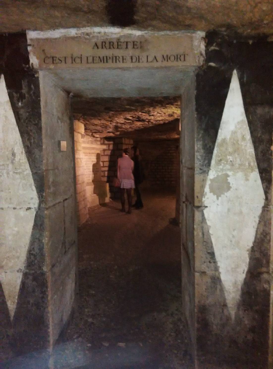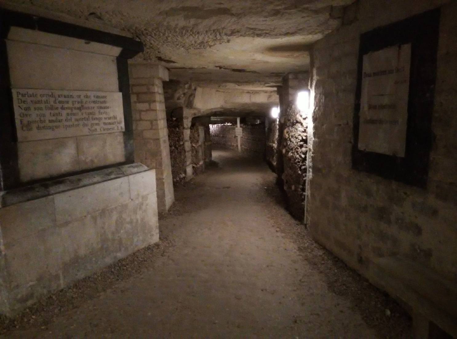 牆面上層層堆疊的骸骨與石碑上刻寫的拉丁語警語——「Arrête! C’est ici l’empire de la mort.(停步!此乃死亡之國度)」——在昏黃燈光下格外震懾人心。